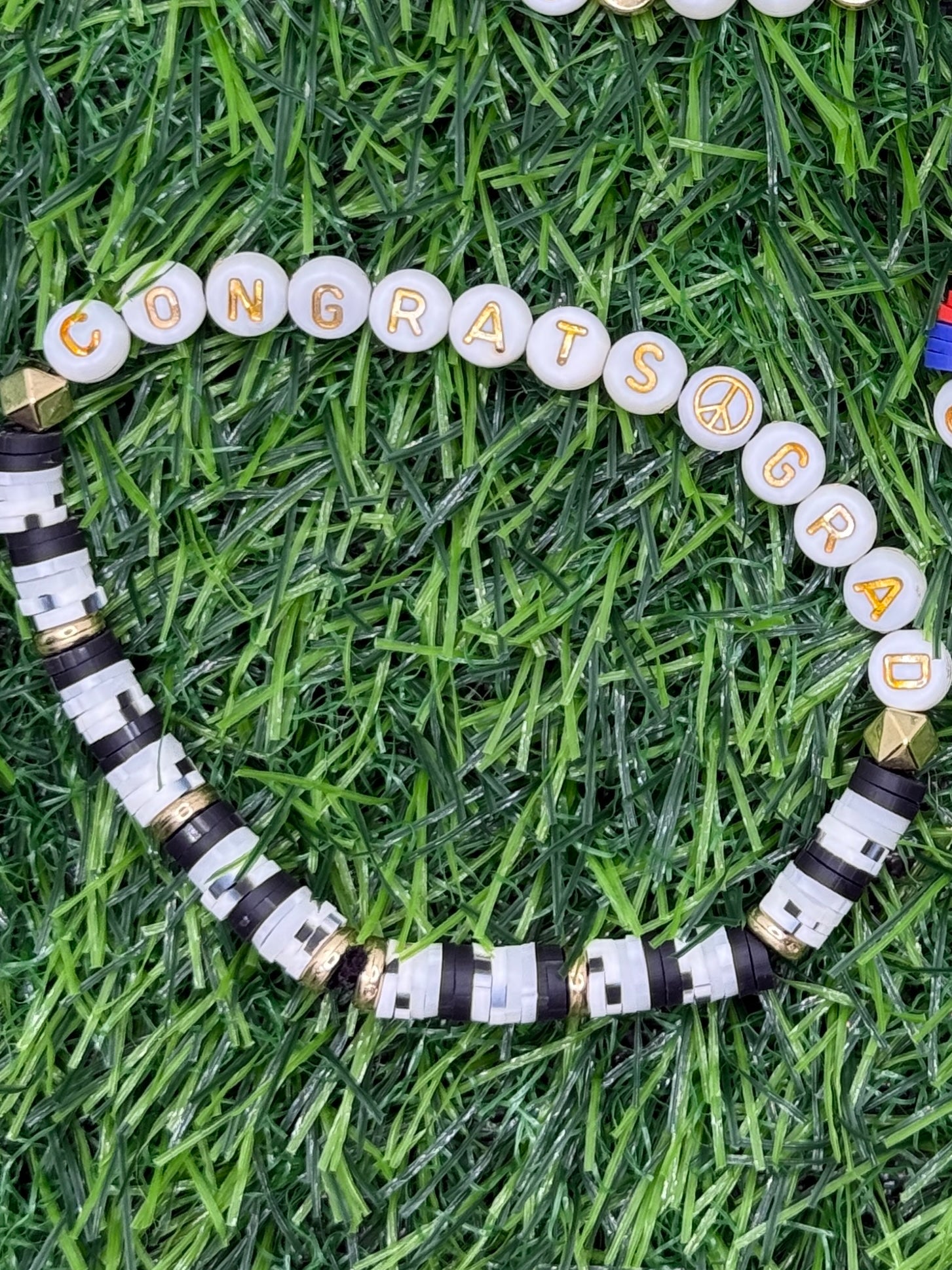 This cute elastic bracelet with black and white beading and “Congrats Grad” wording, is the perfect gift for your upcoming graduate. It comes on a nicely engraved wooden card for a beautiful presentation.